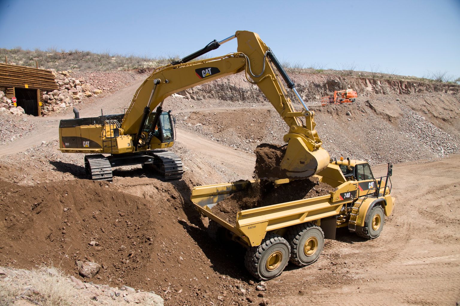Cat 740 Ejector with 42 ton rated payload offers proven reliability and durability, high productivity, superior operator comfort and lower operating costs.Spacious two-person cab with forward facing trainer/passenger seat and off road oil/nitrogen front suspension cylinders keep the operator comfortable through out the working day.True “on-the-go” differential locks with simple operation improve cycle times and productivity.Strong, durable Cat ACERT engines and electronically controlled transmissions deliver high productivity with low fuel consumption.