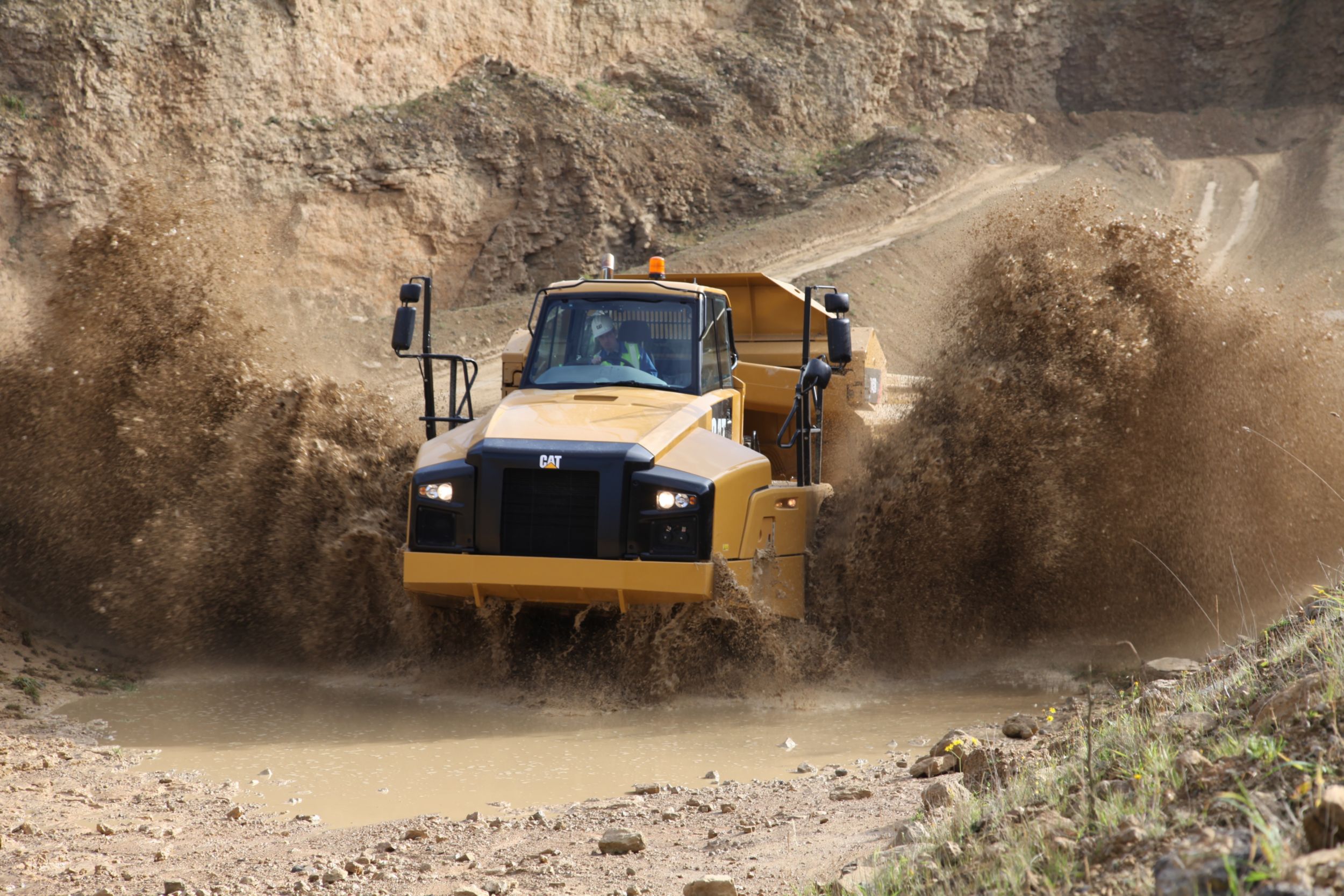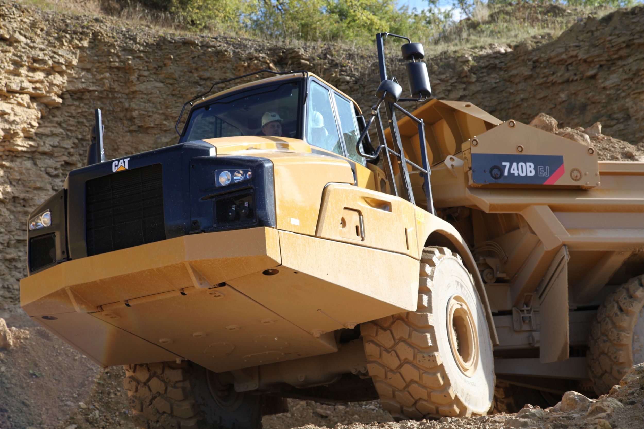 The new Cat® 740B with 39.5 tonnes (43.5 tons) rated payload offers proven reliability and durability, high productivity, superior operator comfort and lower operating costs. The spacious two-person cab with forward facing passenger seat and off road oil/nitrogen front suspension cylinders keep the operator comfortable through out the working day. The true “on-the-go” Automatic Traction Control (ATC) system automatically modulates the correct level of Inter-Axle and Cross-Axle differential lock engagement which will improve cycle times and productivity. No operator interaction is required. The strong, durable Cat ACERT™ engines with the Tier 2/Stage II exhaust emission solution and electronically controlled smooth shifting transmissions deliver high productivity with low fuel consumption. There are significant changes/improvements to the engine/transmission software that result in smoother gear changes.