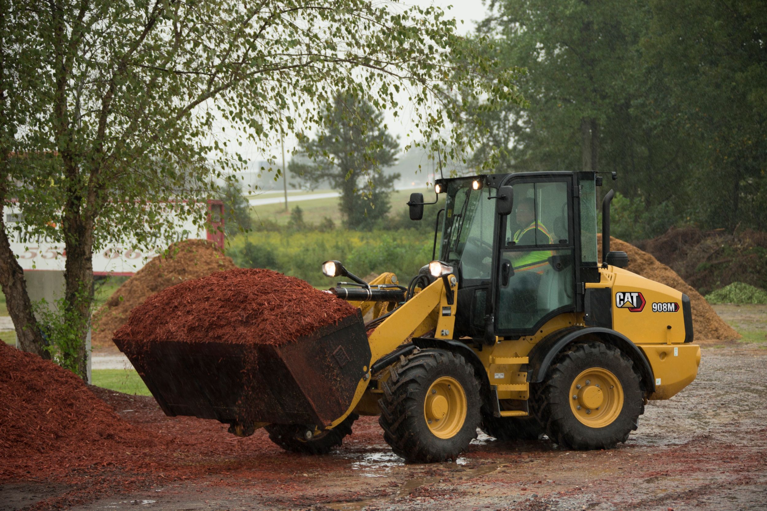- Specifications shown are for a machine configured with general purpose buckets, bolt-on cutting edges, 75 kg (165 lb) operator, Dunlop 405/70 SPT9 tires, full fuel, comfort ROPS cab, standard flow hydraulics and skid-steer coupler. The 908M is configured